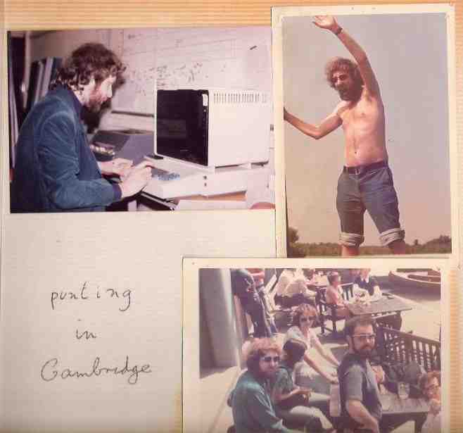 On the right a day out punting in Cambridge, who are those girls Tom and Damian brought with them? Note the ITT 3210 VDU Terminal with the (still) attached keyboard and the MEMs on the whiteboard behind it. Haven't the colours faded?